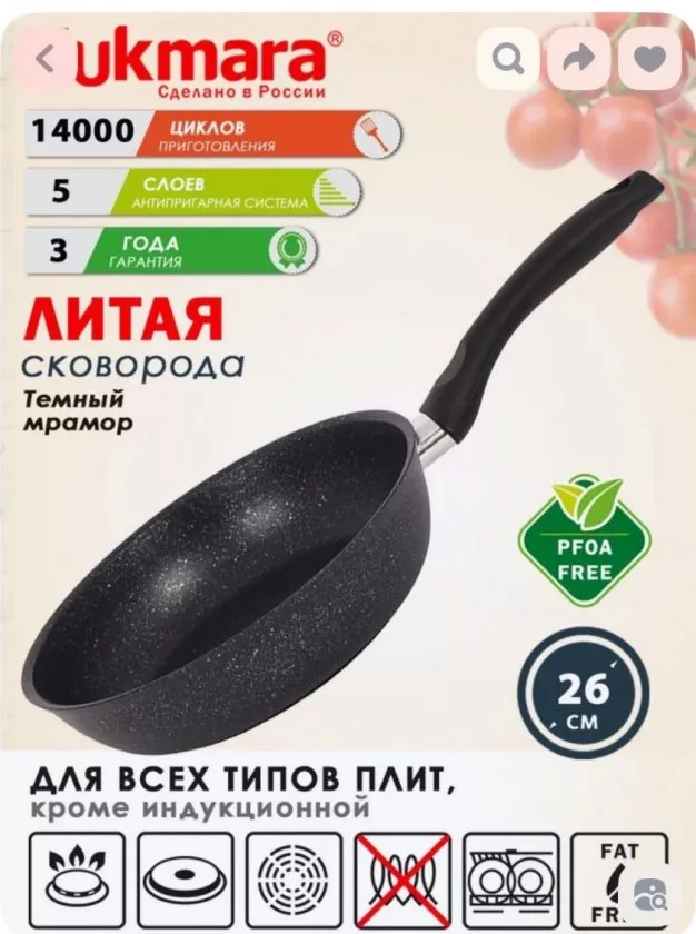В этом отзыве я хочу поделиться своим опытом покупки новой посуды от российского бренда Kukmara. Это сковорода диаметром 260 мм и высотой 60 мм со съемной ручкой и антипригарным покрытием.