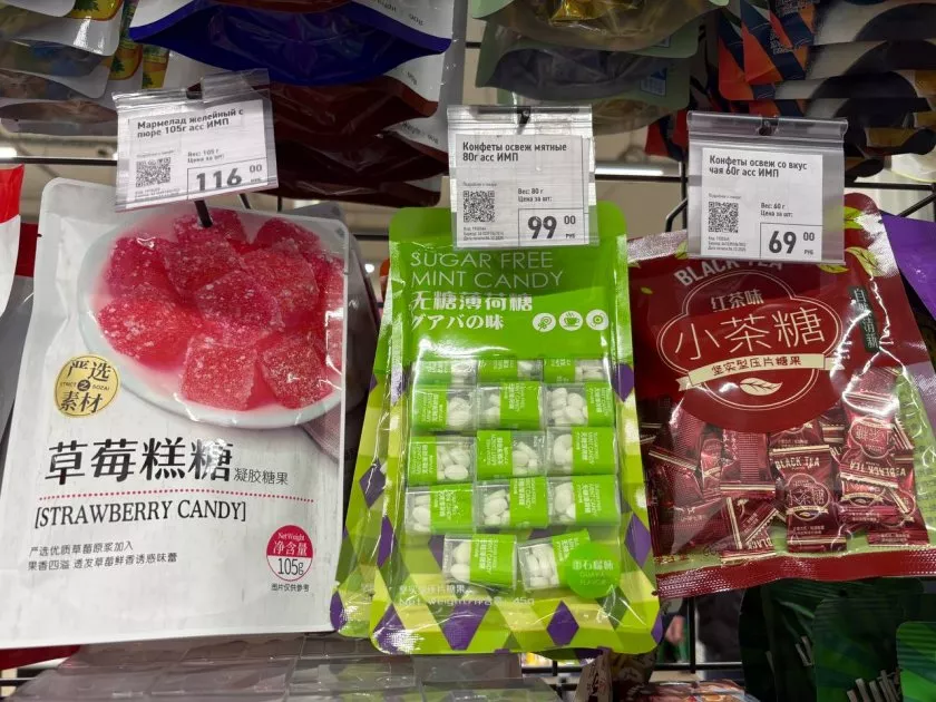 Также на полках есть множество конфет. Например, освежающие мятные, со вкусом чая и мармеладки с желе. Хочется попробовать все, но пока стараюсь держать себя в руках.