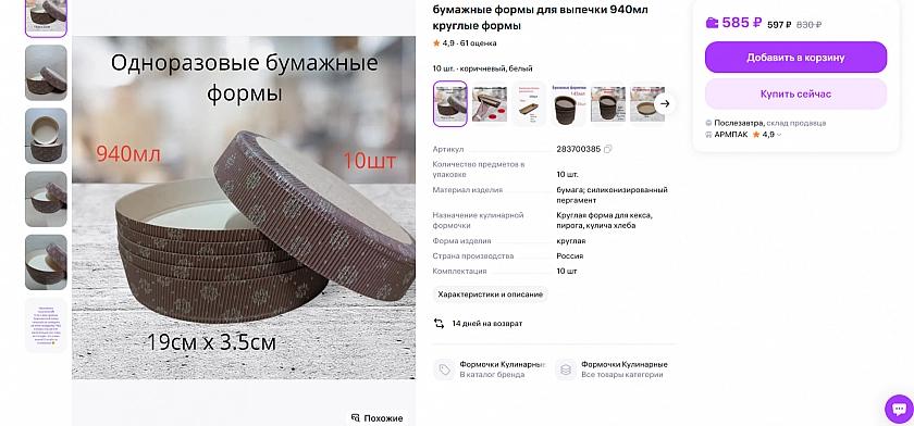 Круглые бумажные формы большого объёма из жаростойкой бумаги. Не требуют смазывания маслом, выпечка легко извлекается. Подходят для духовки, микроволновки, хранения и заморозки.