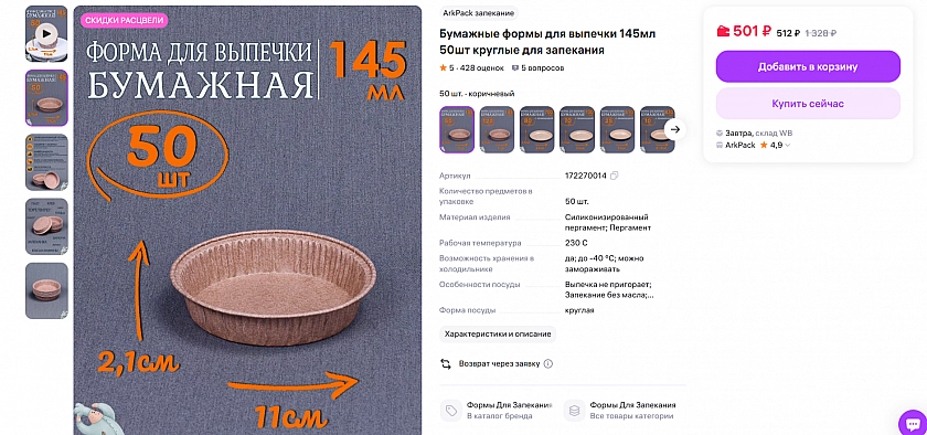 Комплект из 50 форм из силиконизированного пергамента. Жаростойкие, подходят для электрических и газовых духовок, микроволновки.