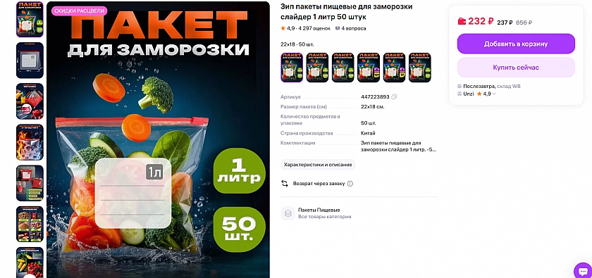 Набор из 50 пакетов — хороший запас для длительного использования. Также есть варианты на 2 и 3 литра.