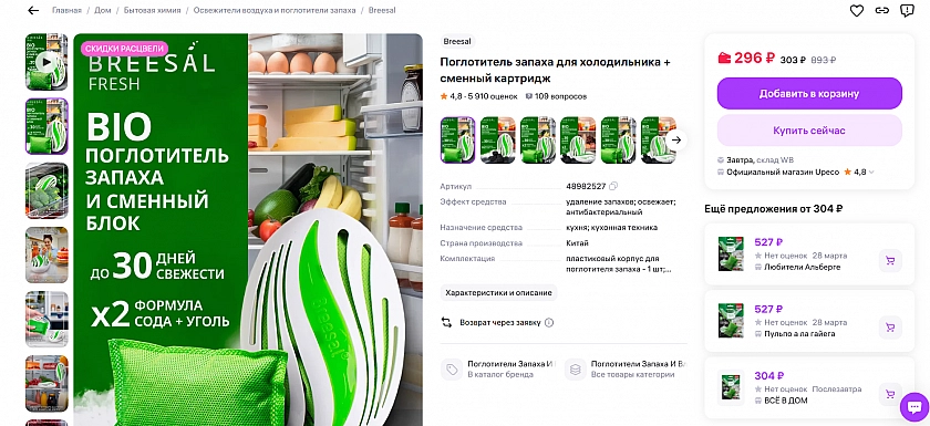 Поглотитель запаха для холодильника Breesal + сменный картридж