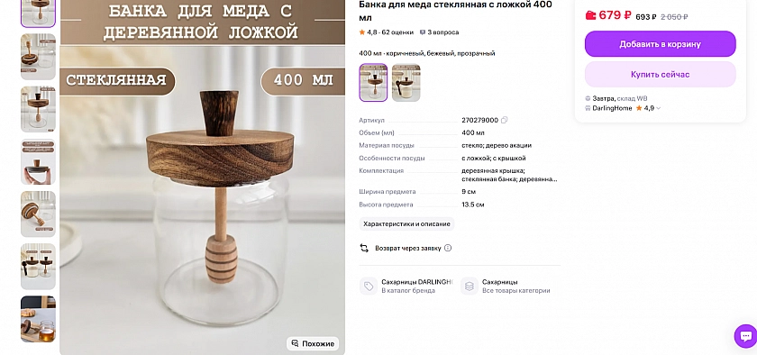 Стеклянная банка из термостойкого стекла с деревянной крышкой и ложкой-веретеном из акации. Практичный и стильный аксессуар для кухни. Объём 400 мл подходит для мёда, варенья и других деликатесов.
