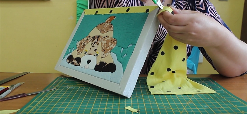 Вырежьте кусочки ткани нужного цвета и размера. Приложите их к пенопласту, зафиксировав края в бороздках. Продолжайте, пока не «напишете» всю картину. Наклейте на изнанку картон и оформите в рамку.