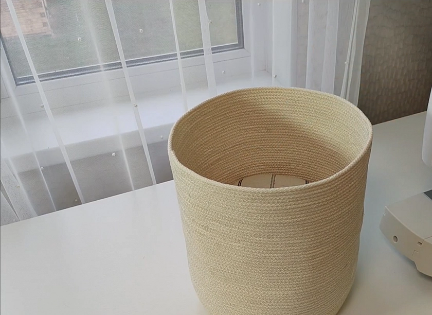 Найдите форму для корзинки (салатник, коробка, ведро и т.д.). Оберните шнур тканью, приклеивая ее через каждые 5 см горячим клеем. Начинайте придавать форму, делая дно и стенки. Закрепите край шнура горячим клеем.