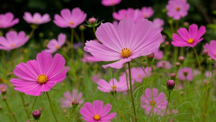 Космея вырастает до метра высотой, создавая ажурное облако из розовых, белых или малиновых соцветий. Неприхотлива, засухоустойчива, цветет до заморозков и дает обильный самосев.