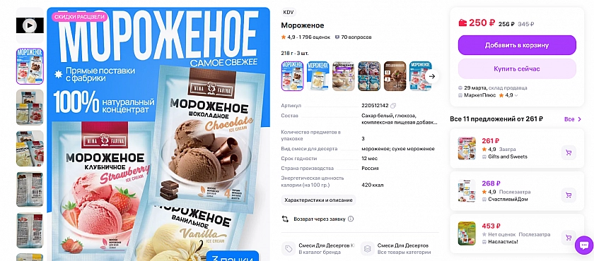 Этот продукт не полезен, но иногда можно побаловать себя домашним мороженым. Одного пакетика смеси хватает на всю семью. В ассортименте есть клубничное, фисташковое и ванильное мороженое. Для приготовления понадобится молоко. На упаковке есть подробная инструкция.