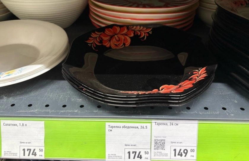В этот раз я решила пробежаться по отделу с посудой. Мой взгляд упал на черные тарелочки. На них есть мотивы хохломской росписи. Очень красивая тарелка, чтобы выкладывать закуски и угощения.