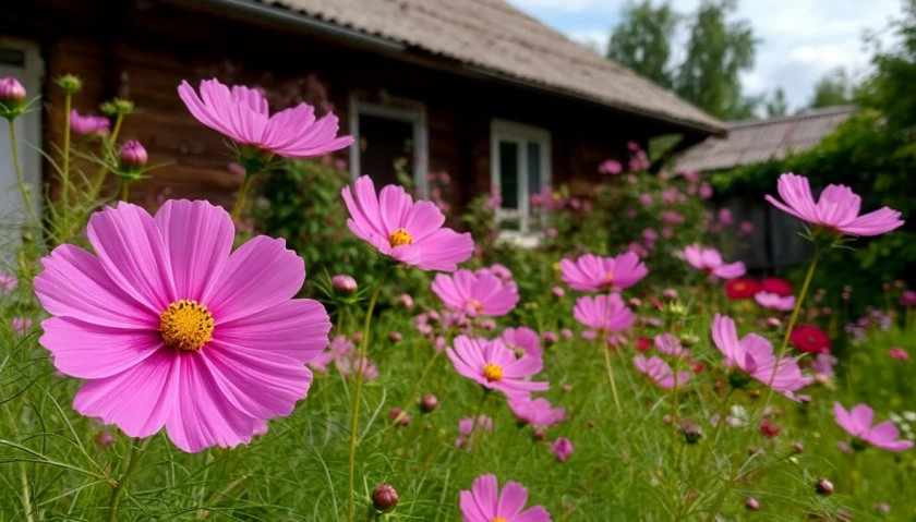 Выращивание космеи не составляет труда. Семена высевают в теплице или сразу в открытый грунт. Растение отлично сочетается с дербенником, агератумом, льном и гибридной геранью. Особенно выигрышно космея смотрится у входа в теплицу или зону активного дачного движения — там, где мимо неё невозможно пройти. Бело-розовая смесь создаёт нежный и воздушный образ, который при этом не требует сложного ухода.