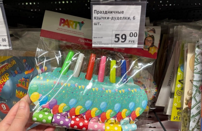За 59 рублей в продаже имеются язычки-дуделки. В наборе идет 6 штук - детишки любят яркие и громкие звуки, поэтому такое дополнение к празднику точно придется по душе.