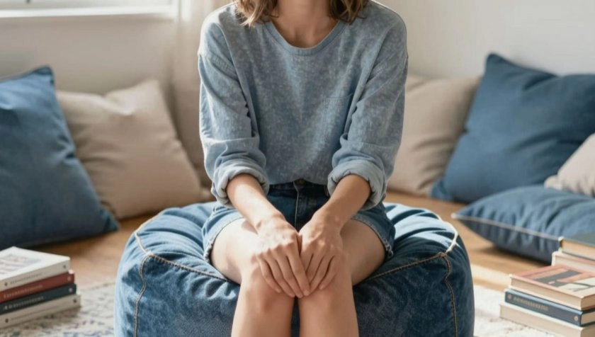 Один из самых популярных вариантов — джинсовые чехлы на пуфики и табуреты. Ткань служит годами, почти не протирается и легко чистится. Особенно удачным решением считается использование джинсового пояса: эта часть брюк, которую чаще всего выбрасывают, при умелом подходе превращается в оригинальный декоративный элемент.