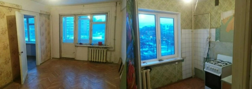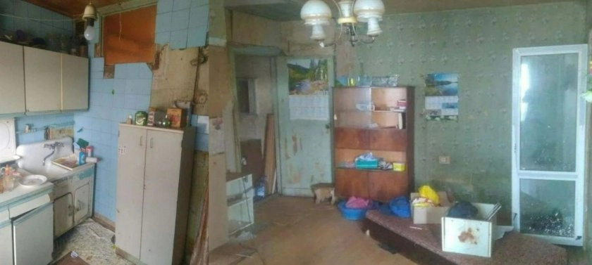 Квартира досталась молодой паре от родителей. Жить в ней было практически невозможно. Кухня напоминала руины с осыпающейся плиткой, жилые комнаты оказались заставлены старой мебелью. Полы скрипели, через старые обои просвечивали огромные неровности стен — вся отделка требовала полной замены с предварительным выравниванием поверхностей.