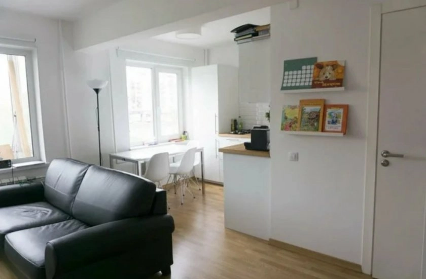 В квартире провели капитальный ремонт с масштабной перепланировкой. На кухне убрали одну из стен, объединив зону приготовления пищи с гостиной. Второй дверной проём (у окна, ведущего в ванную) заложили. Весь коридор присоединили к гостиной, увеличив свободное пространство.