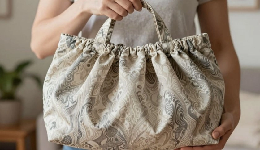 Из плотного портьерного материала получаются отличные хозяйственные сумки. Они пригодятся для походов в магазин, на пляж или на рынок. Готовые выкройки есть в интернете. Для внутренней отделки можно использовать старую футболку или простыню. Чтобы сделать сумку быстро, за основу берут обычный пакет-майку. Удобная деталь — маленькая петелька между ручками, которая позволяет свернуть и зафиксировать сумку.