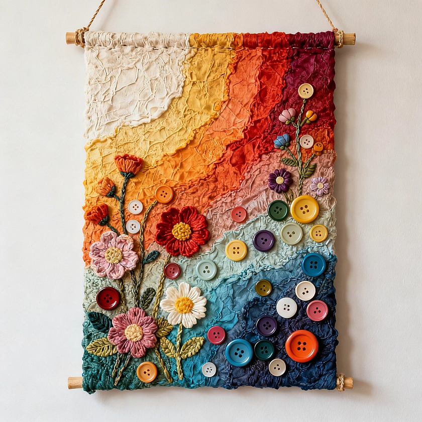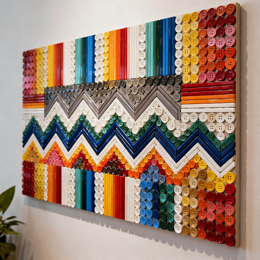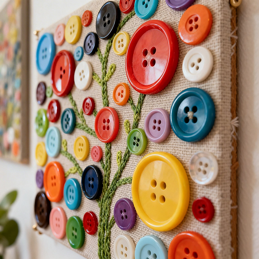 Далее создайте настенное панно. Используйте плотный картон, фанеру или холст. Нарисуйте простой узор: дерево, первую букву имени, контур кошки или хаотичные линии. Заполните контур пуговицами с помощью термопистолета или универсального клея. Даже если у вас нет художественных навыков, всё сводится к аккуратной укладке. Готовое панно не только замаскирует недостатки на стене, но и станет ярким акцентом в комнате.