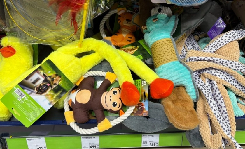Нашла также кучу игрушек. Есть пищалки, мягкие варианты и игрушки для больших собак. Выбор действительно огромный. Но здесь нужно быть внимательным - собака может отгрызть мелкие детали и нитки, потом грозит поход в ветклинику. Поэтому такие варианты лучше не брать.