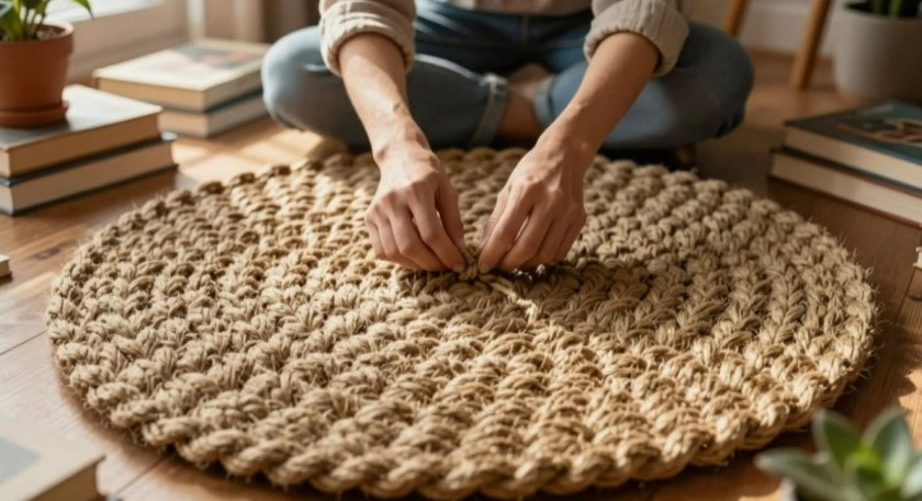 Готовую косу сворачивают по спирали от центра к краям, следя за тем, чтобы она не переворачивалась. Соседние ряды сшивают друг с другом через каждые 2–3 сантиметра. В первых кругах стежки делают чаще. Когда верёвка заканчивается, оставшиеся хвосты выводят на изнаночную сторону и надёжно прикрепляют.
