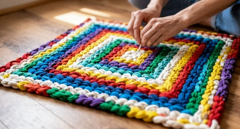 Чтобы сделать такую вещь, не понадобятся ни клеящий состав, ни специальные нитки. В ход пойдёт любая одежда, которая отслужила своё: поношенные майки, старые простыни, вышедшие из моды джинсы. К этому занятию полезно привлекать детей — оно тренирует подвижность пальцев и знакомит с трудом своими руками.