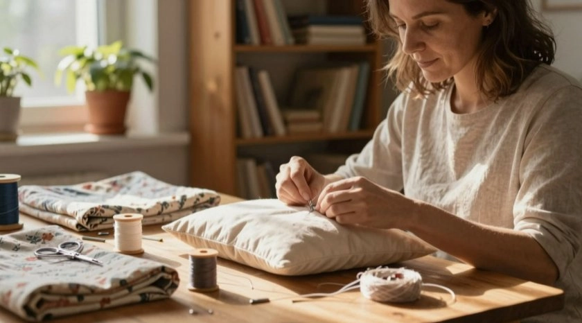 Однако стандартные комплекты не всегда подходят: в доме может быть больше двух подушек, некоторые из них используются для уюта в беседке или путешествий. В таких случаях наволочку можно сшить самостоятельно. Это не требует специальных навыков — достаточно уметь ровно прокладывать строчку.