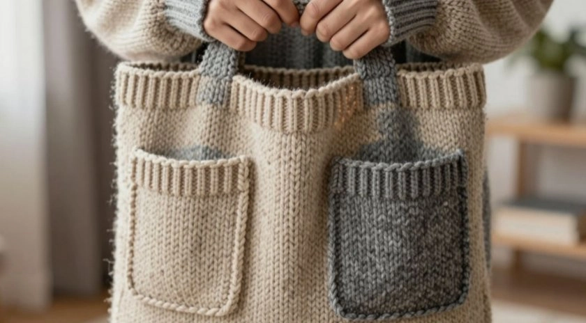 Для изготовления сумки потребуется подкладка, так как вязаный материал растягивается в длину. Обычно от свитера отрезают нижнюю часть с резинкой и пришивают ручки. Их делают из кожи (например, из старого ремня), дерева (покупают в магазине для рукоделия) или плотной ткани: две полоски сшивают лицом к лицу, выворачивают, утюжат и прокладывают строчки по краям.