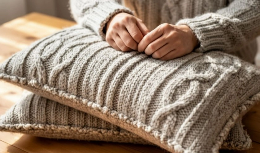Этот проект идеально подходит для начинающих рукодельниц. Чем красивее вязка свитера, тем интереснее получаются подушки. Ими легко украсить диван.