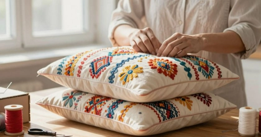 Из старых наволочек и пододеяльников получаются отличные декоративные подушки. Ткань используют целиком или разрезают на лоскуты. Аппликация или вышивка сделают изделие ещё интереснее. Техника проста — выкраивают две одинаковые детали, сшивают с трёх сторон, набивают синтепоном и зашивают отверстие.