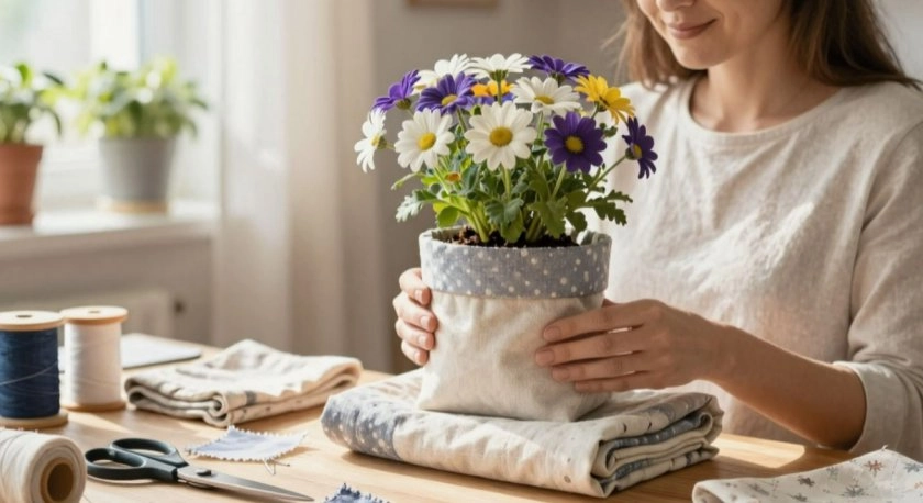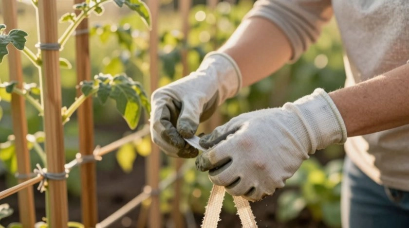 Для садоводов есть полезная идея — подвязки для растений. Из ветхой ткани нарезают полоски шириной 2–3 сантиметра, складывают вдвое, прошивают вдоль и выворачивают. Такие мягкие ленты не травмируют нежные стебли.