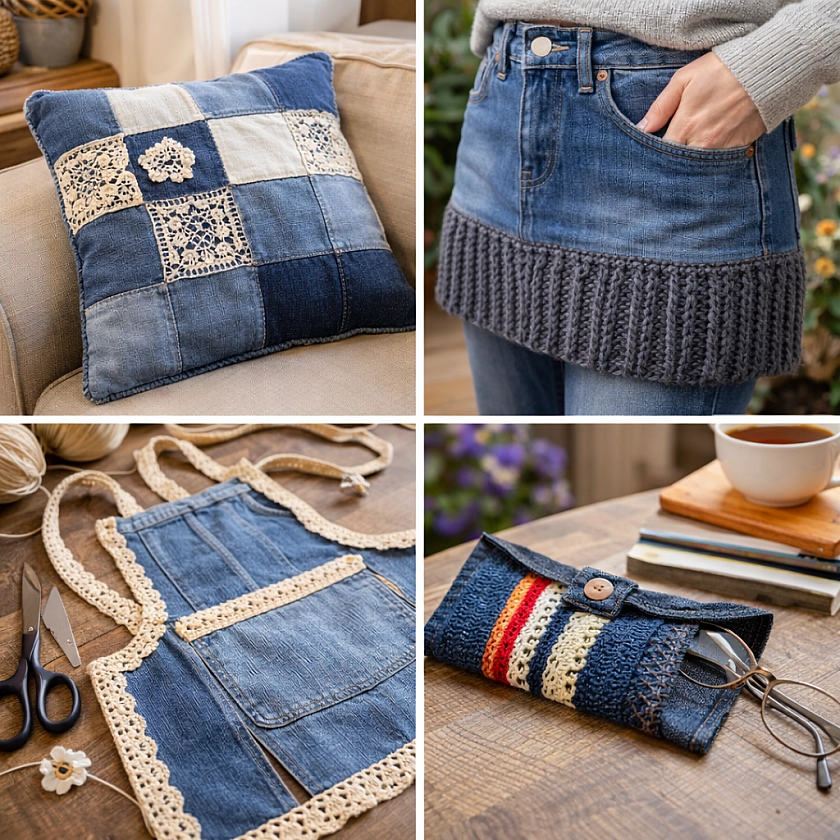 Сегодня хочу поделиться идеями, которые вдохновят вас на творчество. Многие из них не требуют швейной машинки. Вам понадобятся иголка с ниткой, крючок, спицы и желание творить. Давайте посмотрим, как старые джинсы могут обрести новую жизнь с мягким трикотажем и ручной вязкой.