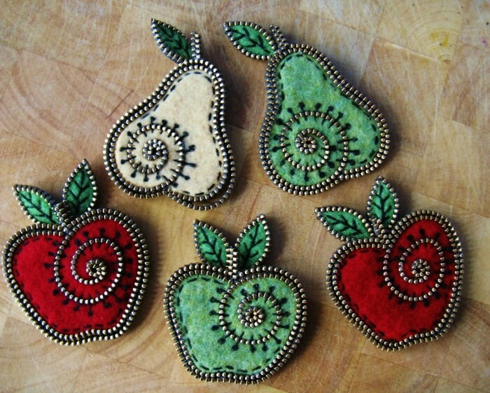 Если добавить немного фетра и фантазии, можно создать яркие броши — например, в виде фруктов или цветов. Молнии здесь играют роль фактуры и контура, а ткань дополняет композицию цветом.