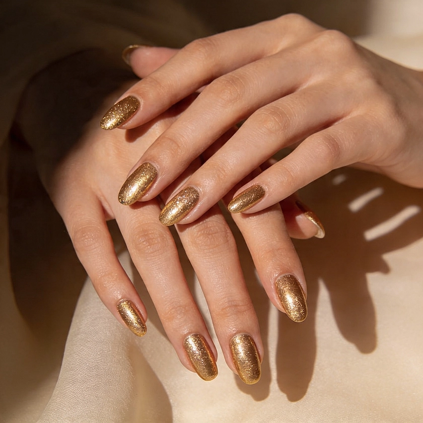 «Золотой можно использовать в виде акцентов: блёстки, узоры, наклейки или стразы добавят роскоши любому маникюру», — объясняет мастер.