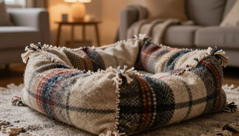 Для бортиков можно вырезать из пледа длинные полосы, сшить их в валики, набить тем же наполнителем и пришить по краям. Получится лежанка с мягкими стенками, в которой собаке или кошке будет особенно уютно.