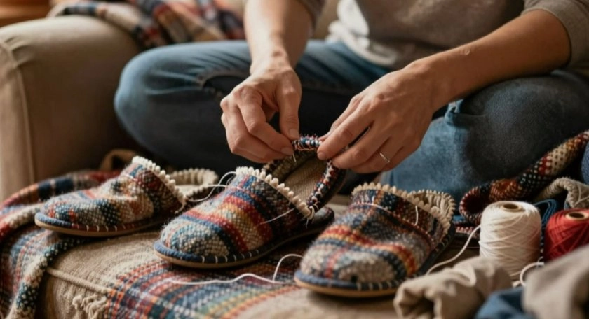 Затем вырежьте верхние части тапок: примерно 5–7 сантиметров в ширину, длиной, чтобы края заходили друг на друга. Приложите верхнюю деталь к подошве, отметьте места соединения и прорежьте небольшие отверстия (или просто пришейте). Если плед очень плотный, можно соединить детали крупными стежками вручную.