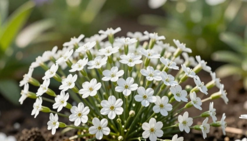 Растение не бросается яркими красками, а создаёт эффект парящих в воздухе белых или нежно-розовых цветов. Оно стелется по земле, формируя густые кустики высотой до 20 сантиметров. В период цветения участок напоминает мягкое покрывало из мелких цветов. Гипсофила хорошо растёт на солнечных сухих местах, не боится засухи, идеальна для бордюров, склонов и каменистых садов. Кустики высаживают с интервалом 30–40 сантиметров, чтобы через пару лет они плотно заполнили отведённое место, но не создали непроходимый ковёр.