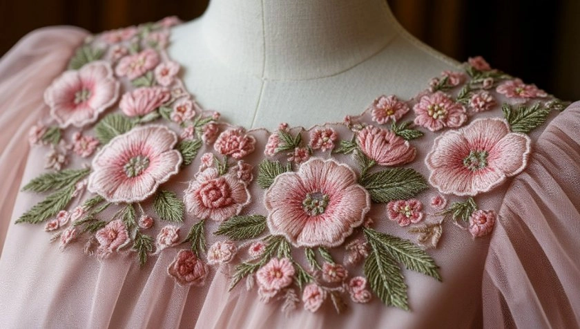 Тюль настолько тонкий, что не утяжеляет вещь и почти не ощущается на теле. Стирать такое украшение лучше вручную или в специальном мешке. Получается эффект «дорогого» декора за копейки и без специальных навыков.