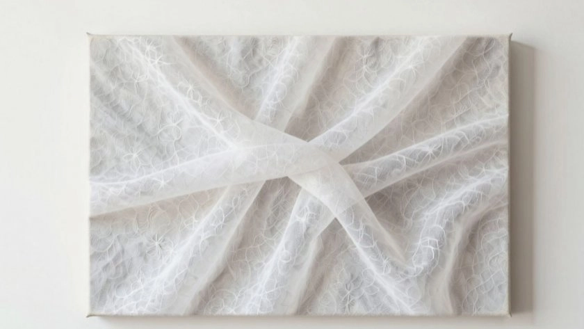 Настоящий арт-объект для интерьера, который не стыдно повесить в гостиной. Холст загрунтовываем белой краской и даём ему высохнуть. Тюль разрезаем на куски по размеру подрамника. Первый слой ткани пропитываем клеем (разведённым 1:1 с водой) и укладываем на холст, создавая складки и неровности. Второй слой кладём перпендикулярно или чуть смещая. Когда клей высохнет, по поверхность проходим белой краской полусухой кистью — так акцентируются все перепады и рельеф.