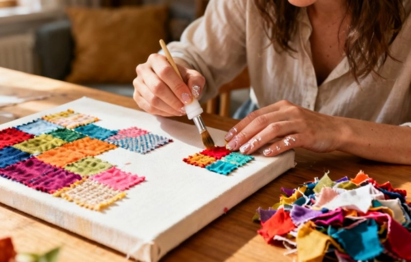 Сначала выбираем простой рисунок — например, цветок, дерево или геометрическую фигуру. Лоскуты нарезаем на мелкие фрагменты: для лепестков подойдут овалы, для листьев — вытянутые кусочки. На основу наносим клей, после чего тканевые детали прикладываем одна за другой, словно собираем мозаика. Ткань можно слегка мять или скручивать — так изображение приобретёт дополнительный объём. Готовую работу оставляем под прессом до полного высыхания.