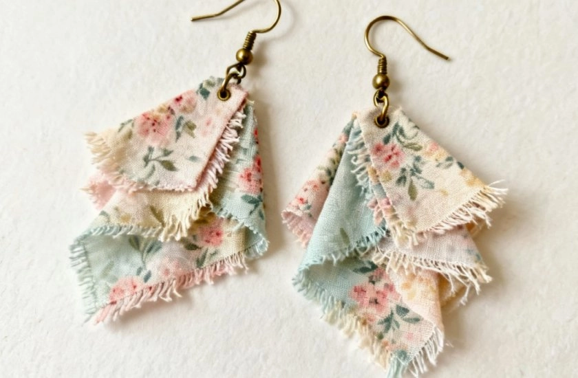 Из ткани вырезаем маленькие круги или лепестки — чем мельче детали, тем аккуратнее получится украшение. Каждый фрагмент слегка опаливаем зажигалкой, если ткань синтетическая, или просто сжимаем пинцетом для придания объёма. Затем собираем цветок или абстрактную композицию, начиная с крупных деталей и заканчивая мелкими. Готовую фигурку приклеиваем к основе для серёг или броши и оставляем сохнуть на 2–3 часа.