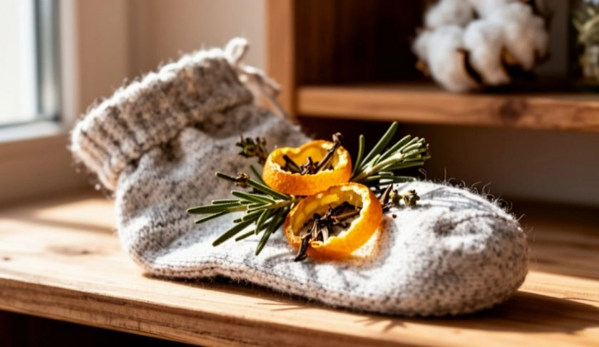 Носок наполняют сухими травами — лавандой, мелиссой или розмарином, можно добавить молотый кофе или любимые специи. Мешочек завязывают и кладут в шкаф или обувную тумбочку. Такие саше освежают воздух, придают одежде приятный запах и отпугивают насекомых.