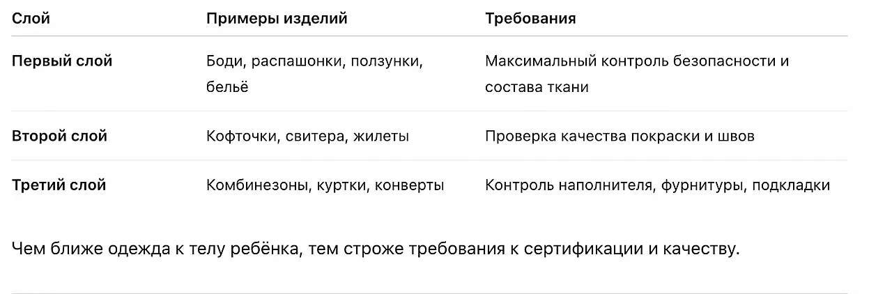 Чем ближе одежда к телу ребенка, тем строже требования к сертификации и качеству.