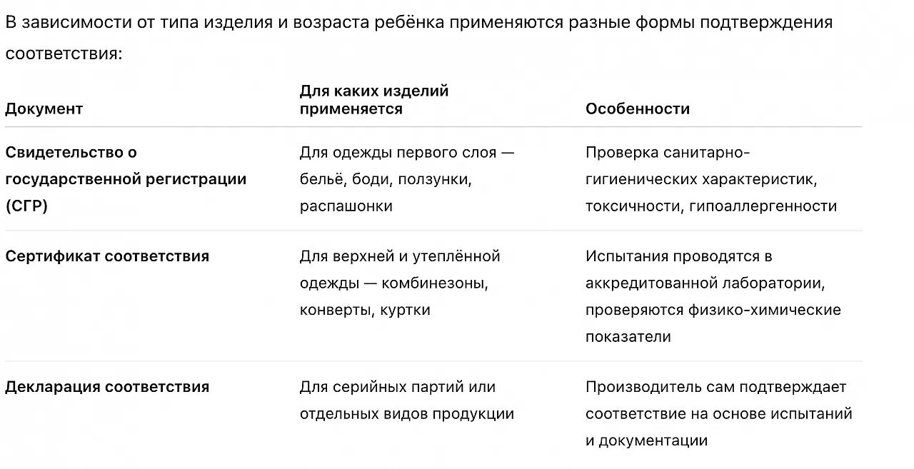 В зависимости от типа изделия и возраста ребенка применяются разные формы подтверждения соответствия: